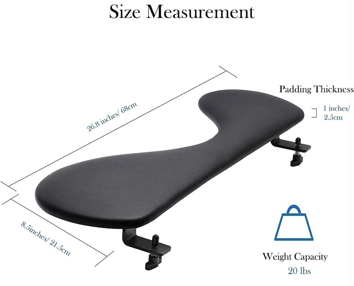 About this item * ✅【COMPUTER ARMREST SUPPORT】Eulps ergonomic arm rest for desk updated circular arc design, the soft arc is more close to you. Adopts high quality leather hand-wrapping technology, built-in high-density sponge, stainless steel and aluminium alloy support, wear-resistant and stable. Holds up to 20 lbs in weight. * ✅【ERGONOMIC DESIGN】 Desk arm support extend the desktop, fully support the arms to relax the upper limbs, correct sitting posture, prevent nearsightedness and cervical spondylosis, improve working conditions. Improve the design many times to find the best ergonomic solution. * ✅【MULTI-USES】This desk forearm support is not only a Armrest pad, but also a wrist rest & elbow rest pad, gives entire arm support for all-day comfort! It is a good choice for Office Work or Home Gaming. It may take a few days for your arms to get adjusted to using this Arm Rest and see results. * ✅【ARM REST EXTENDER】The ergonomic desk armrest typing support offers wide controllable area for computer work. It is comfortable to rest your arm for typing. Relieve stress on your wrists and shoulders. Please refer to the desktop style of the picture and measure the thickness of the desktop (within 1.6”/4cm) to ensure enough space for the C-clamps. * ✅【EASY INSTALLATION】 According to the installation instructions, quick installation. Put the pad with the sturdy C-clamps attach to your desk with simple hand tightening. The whole process is easy with only two steps. Non-hole installation ensures that the desktop is intact.