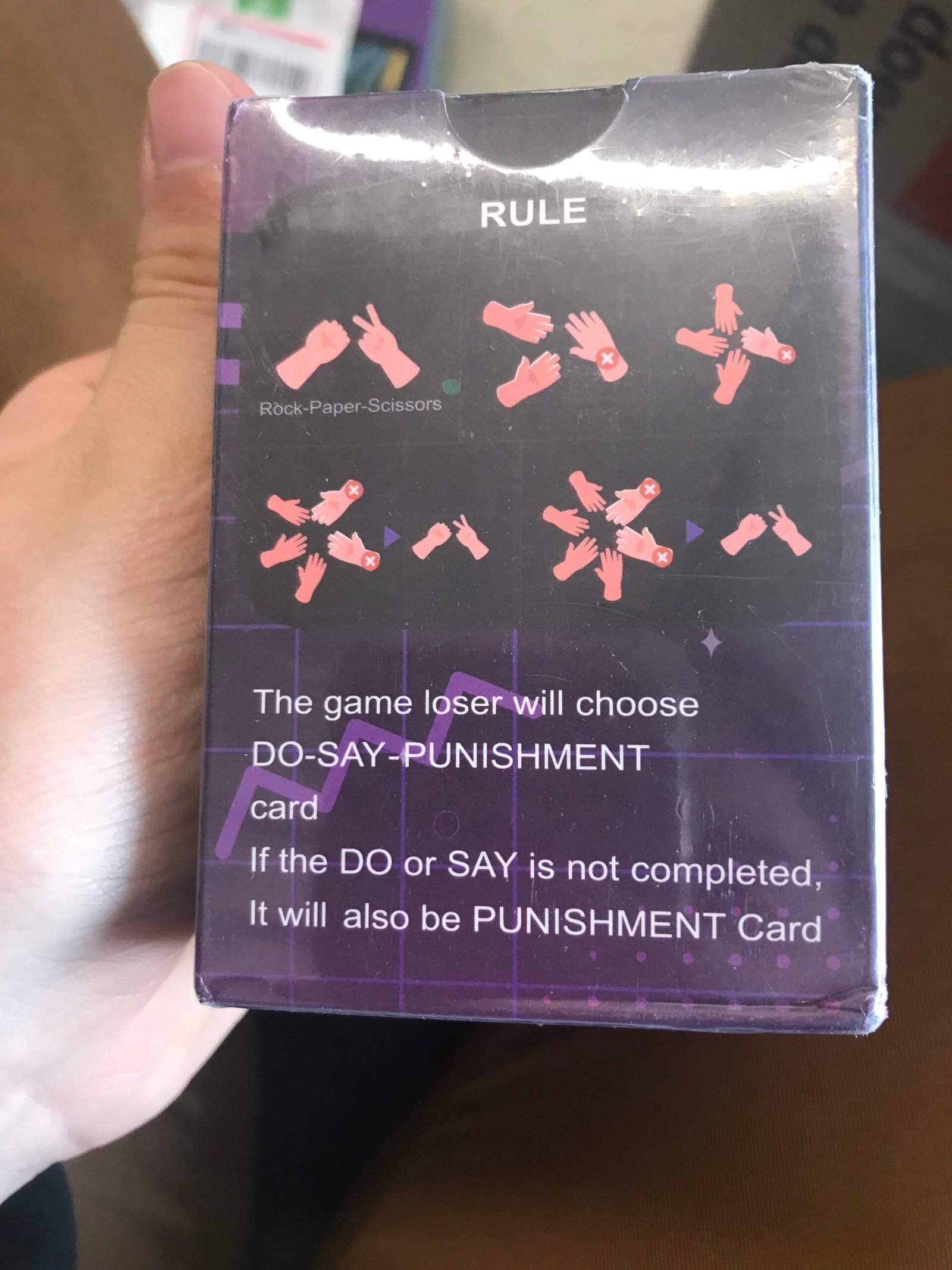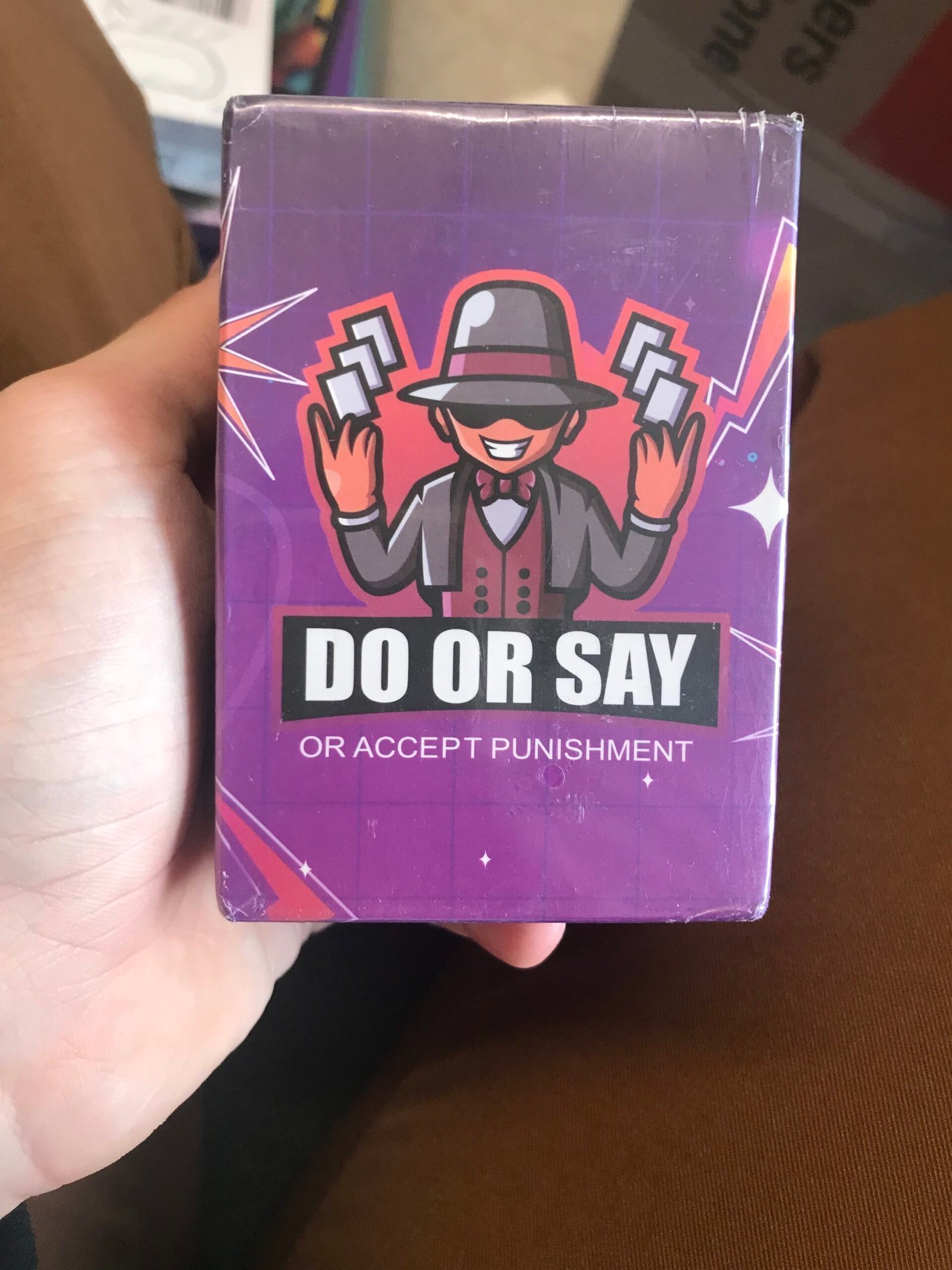 A card game, Do or say or… accept the PUNISHMENT. Seems like a truth or dare ripoff but should be fun! Great to play when bored, and with friends and family. The cards are sealed and unopened!